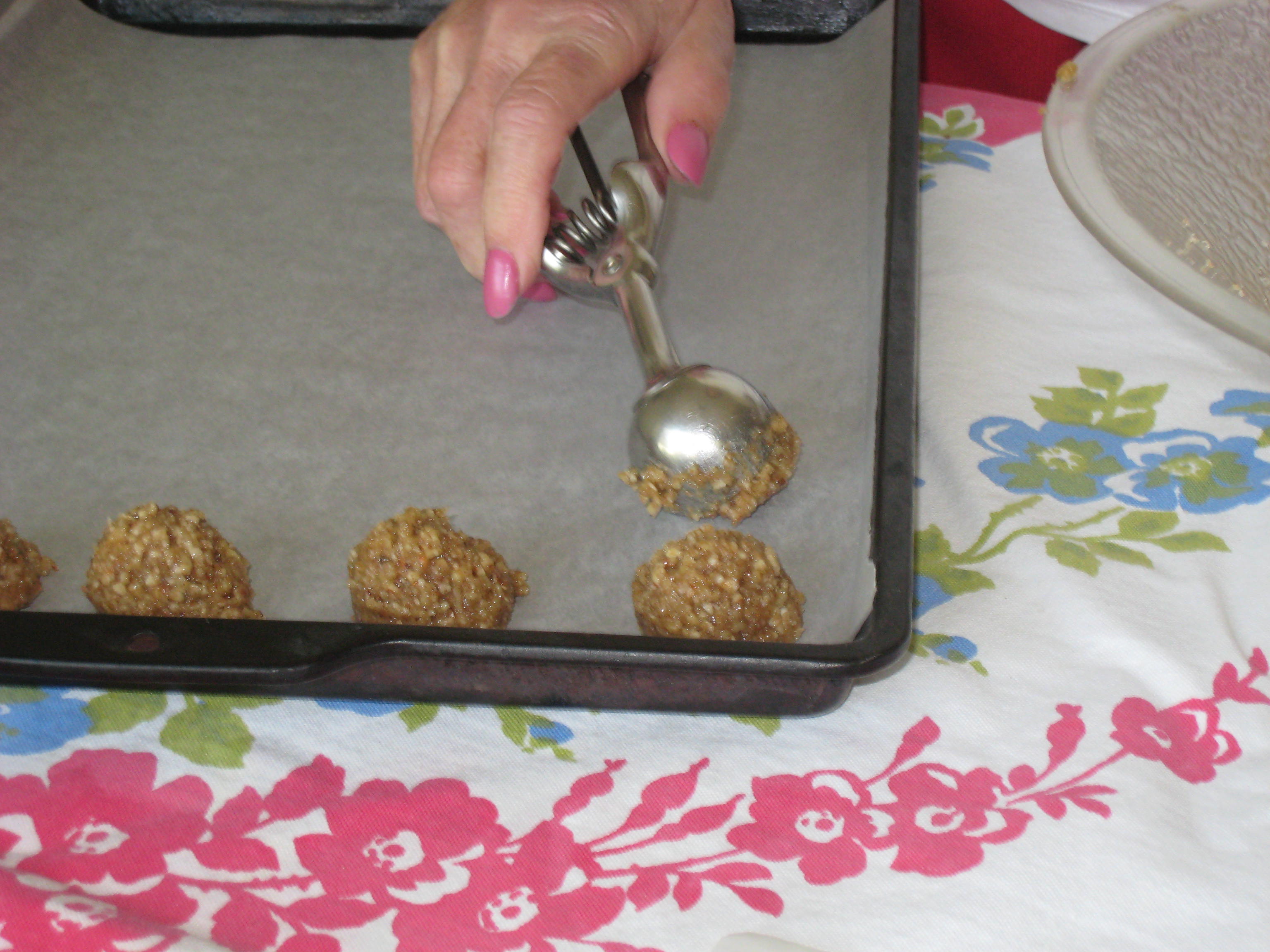 As soon as I walked in to Kaye’s home, I felt so welcome. The dough was already prepared. “I know that you know how to make this dough. It is the same as the bureka dough your mother-in-law Becky makes,” Kaye told me. So we immediately started with the conduchu, a meat filling which consists of ground beef, onions, parsley (some cooks add cut up brown hard boiled eggs). We went to the dining room table, where there were three boards and trays of dough. Kaye and Marcia had already formed the dough into apricot size balls (for the cups) and smaller walnut size balls (for the hats).