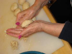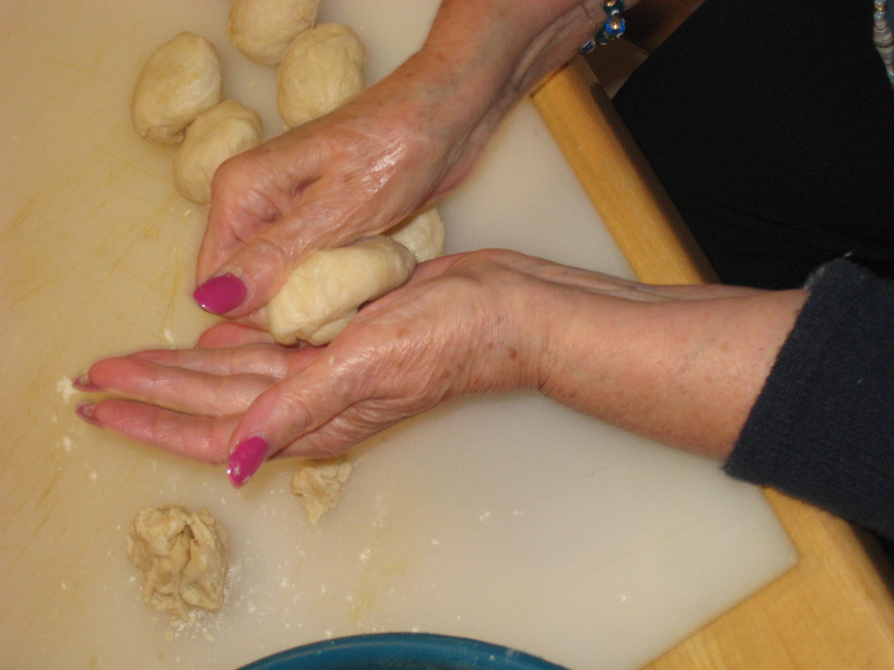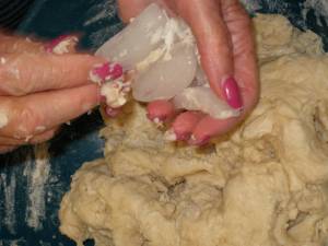Separate dough into 4 portions. Pinch off “walnut” sized balls and place on a work surface. Work each ball in the palm of your left hand (if you are right handed). Use your right hand to tuck the dough under and into itself, working to make it a smooth ball. As balls are formed, place them on a parchment lined baking sheet. Once all the balls are prepared and the dough has had a chance to “rest,” begin by placing 6 balls on work surface. Using your fingers, press out the dough; then, with a small rolling pin, make oval shaped, flat forms. Using a tablespoon or small scoop, scoop filling into the middle of the flatten dough.