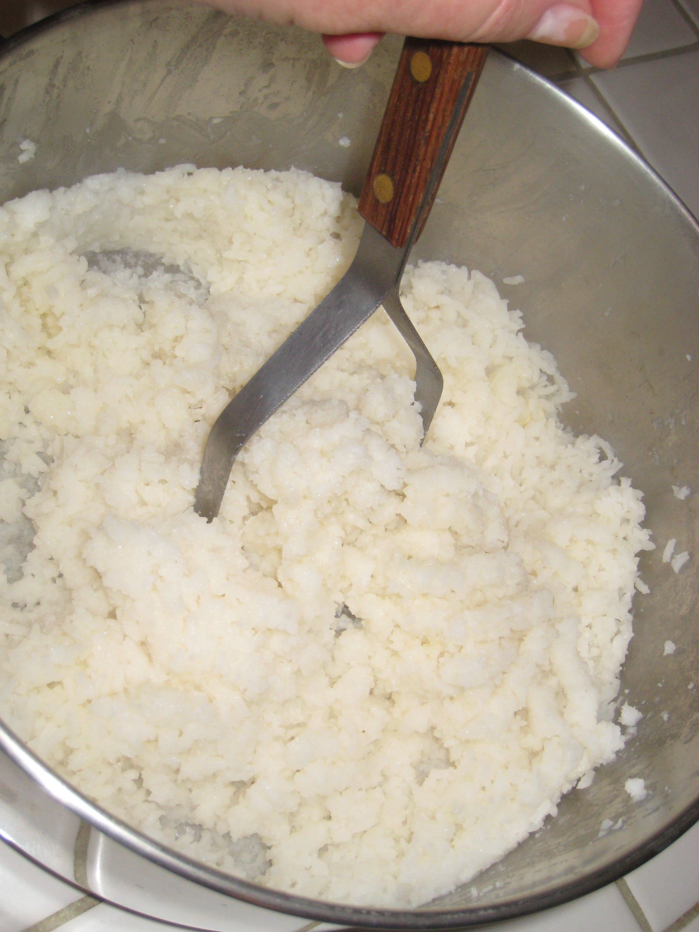 Mash rice w/potato masher; Add cheeses and eggs and continue to mash. Mixture should be damp, not dry.