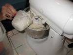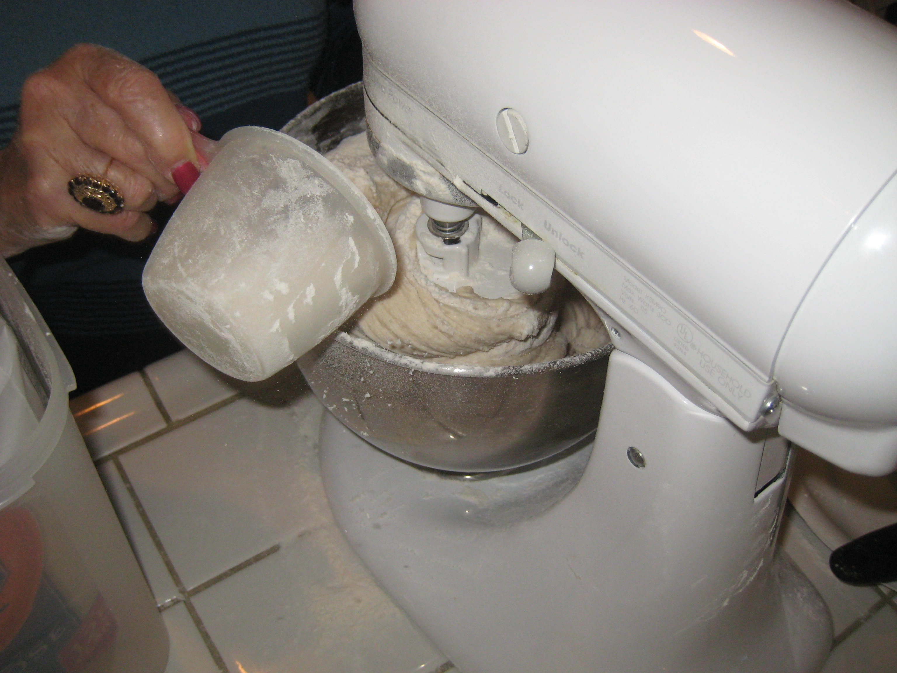 in mixing bowl ad 3 1/2 C water (tepid, lukewarm), add yeast mixture, and salt. Turn mixer on low as you begin adding flour, 1 cup at a time. After all flour is incorporated into dough, mix on medium, until dough begins pulling away from the sides of the bowl. Looking for a smooth, soft dough – one that does not stick to your hands. Key is using as little flour as possible to achieve this consistency. Turn dough onto lightly floured work surface.