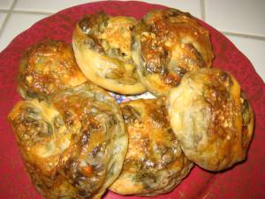 Once your dough is opened, place a hand full of your prepared spinach and cheese in the middle of the dough. Roll it like a jelly roll. Coil the roll, as in the video. Place on your baking sheet. Repeat, making all your boyos. Paint with an egg wash ( 1 beaten egg with 2 tsp of water added). Sprinkle with grated cheese. Place in a preheated 350 degree oven. Watch oven until boyos are a golden brown ( about 15 minutes). Remove from oven. (Take a bite of one…and know divine flavor!!!!)